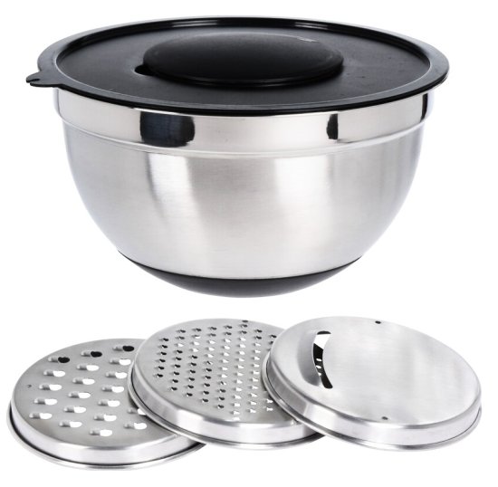 • večnamenska posoda iz nerjavečega jekla s tremi strgalniki- posoda je izdelana iz nerjavečega jekla, pokrov pa je silikonski- posoda za mešanje in strgalnik v enem- zaradi delne odprtine v silikonskem pokrovu lahko mešate in stepate brez pršenja- celoten pokrov je seveda popolnoma odstranljiv- ko pritrdite zamenljiv strgalnik, lahko hrano naribate neposredno v posodo- dno posode ima silikonsko prevleko, zaradi česar je nedrseče- prihrani kuhinjo pred nepotrebnim neredom, poleg tega pa prihrani prostor v kuhinji- komplet vključuje 3 različne nastavke za ribanje:- fino strganje- grobo strganje- strganje za rezanje- mere: 25,5 × 14 cm