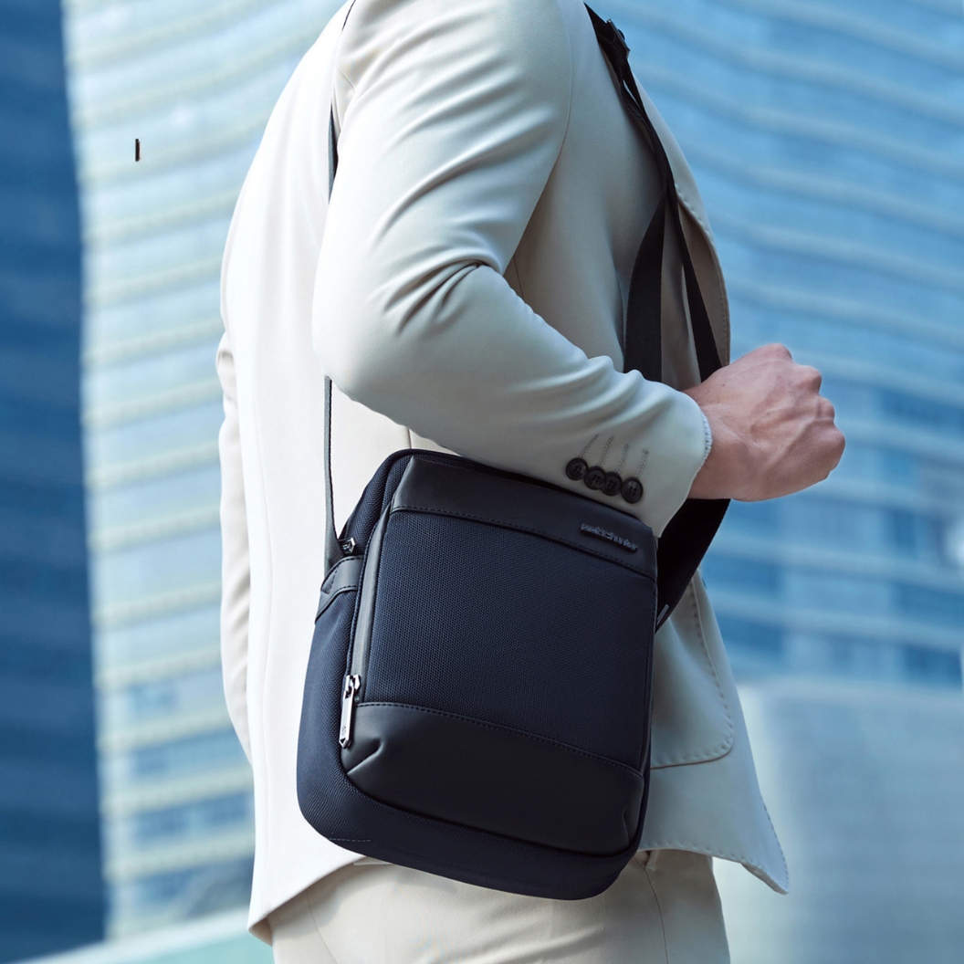Ta elegantna in praktična poslovna torba v modri barvi je odlična izbira za sodobne moške, ki cenijo udobje, funkcionalnost in stil. Izdelana iz trpežnega, vodoodpornega materiala, je odlična kot vsakodnevna torba na ramo – tako za v službo, univerzo kot za priložnostne mestne izlete ali sprehode .
