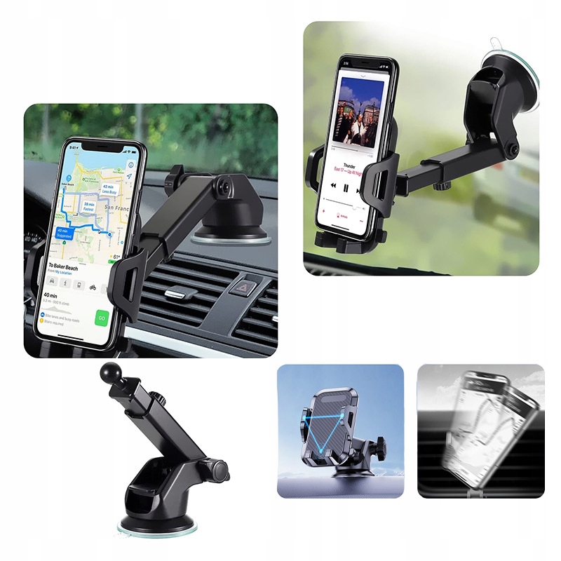 Ta univerzalni nosilec je bil zasnovan z mislijo na maksimalno udobje in prilagodljivost vašim vsakodnevnim potrebam. Gre za rešitev 3 v 1, ki jo lahko preprosto namestite na armaturno ploščo, vetrobransko steklo ali armaturno ploščo – točno tam, kjer vam je najbolj priročno.