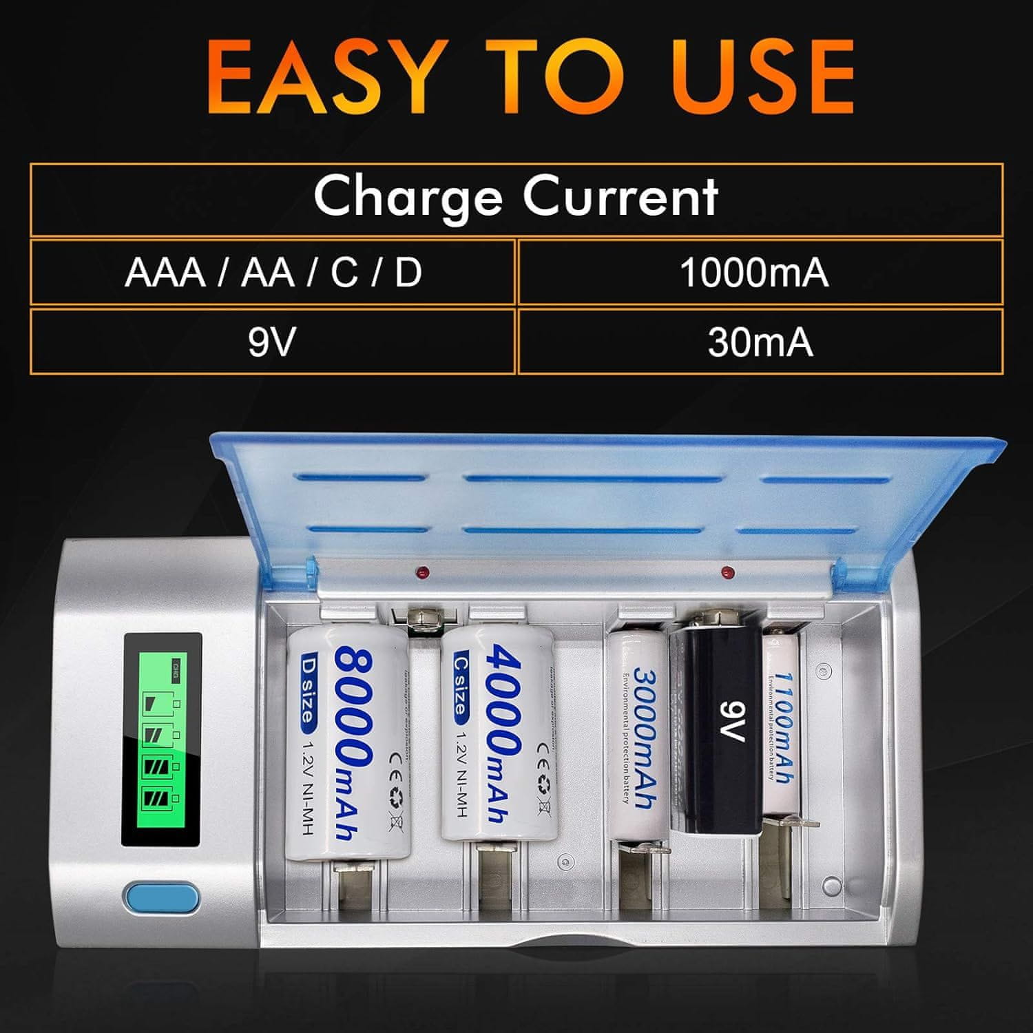 Polnilec podpira široko paleto baterij, vključno z AA, AAA, SC, C, D in 9V Ni-Mh/Ni-Cd , zaradi česar je izjemno univerzalen in vsestranski.