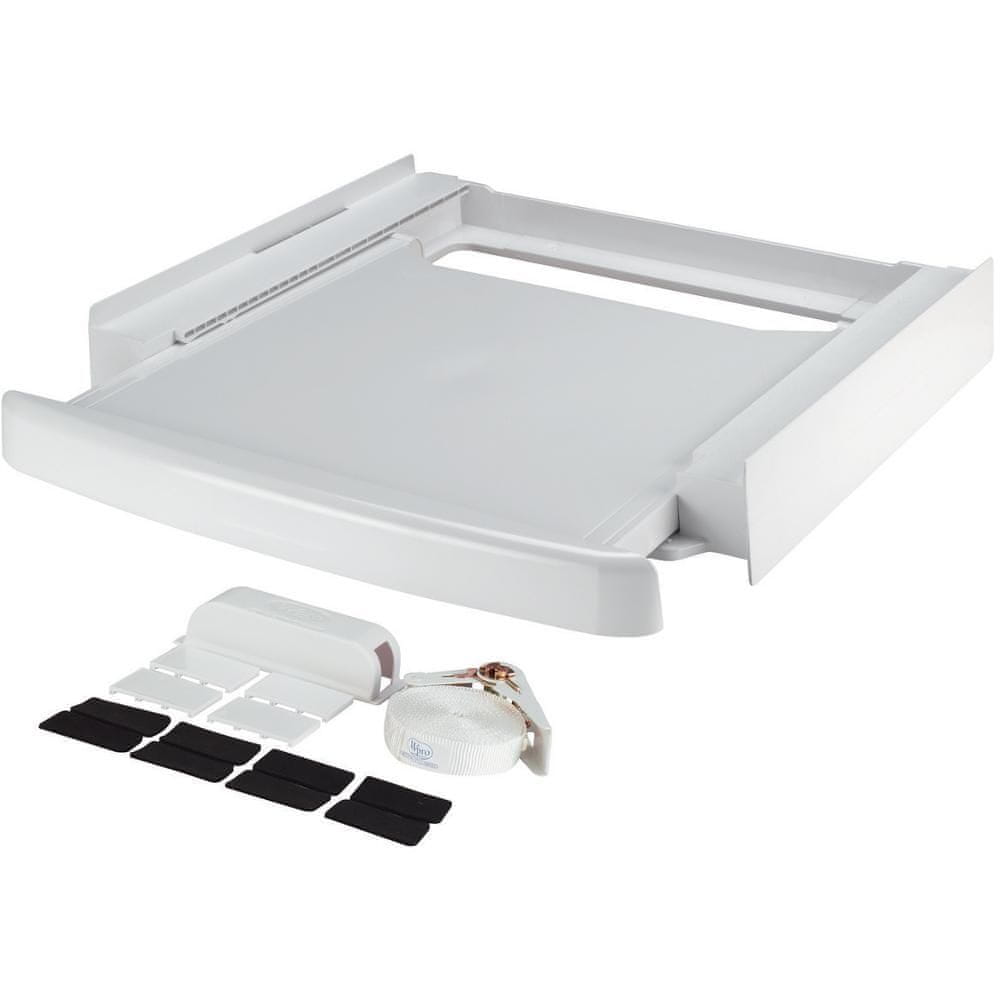 Univerzalni prostor med pralnim in sušilnim strojem Z izvlečno polico za shranjevanje perila Varna namestitev zaradi naprave Safe-in-Lock Združljiv z dimenzijami 60 × 60 cm Material ABS plastika Zagotavlja vzdržljivost in popolno oblikovno usklajenost z aparati
