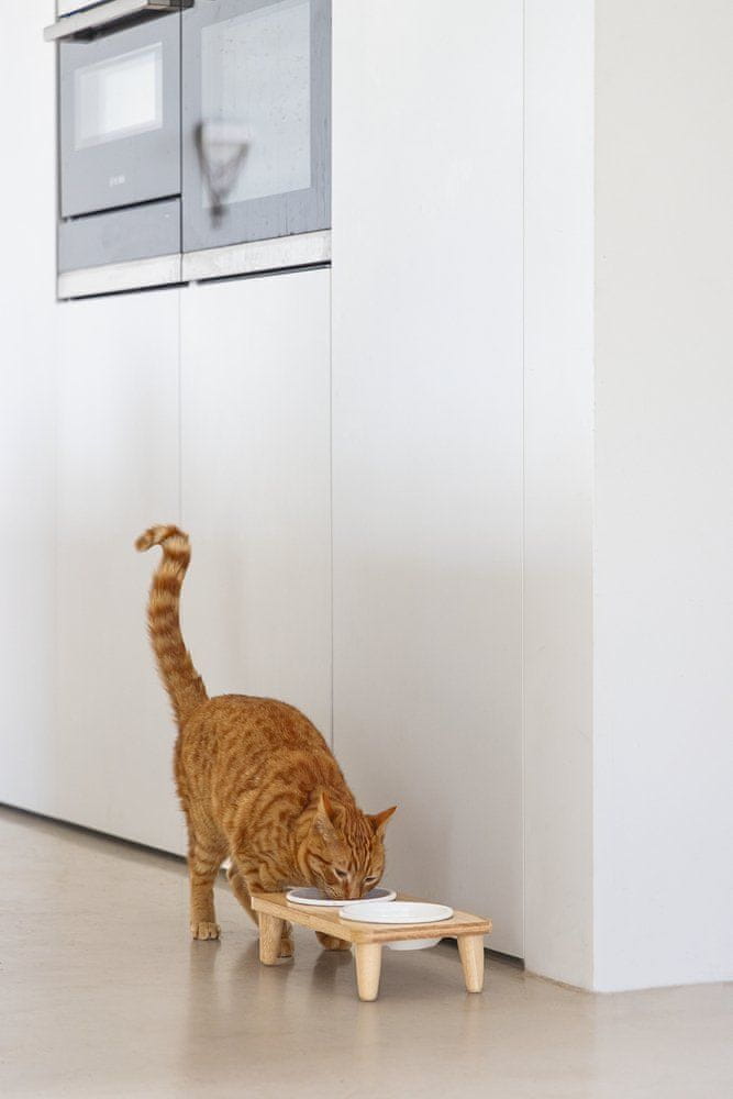 Pustite svojemu hišnemu ljubljenčku elegantno jedilno garnituro Djeha. Komplet vključuje dve keramični skledi, v katerih lahko hkrati postrežete hrano in vodo. Sta skledi umazani? Zadovoljni boste z njihovim preprostim vzdrževanjem – sklede lahko pomivate v pomivalnem stroju. Stojalo iz gumijastega lesa dopolnjuje čudovit videz in vaši notranjosti daje čudovit, naraven videz. Prav zaradi preprostega in čistega dizajna je posoda Djeha primerna za različne sloge notranjosti. Komplet ni primeren le za mačke, temveč tudi za majhne pse.