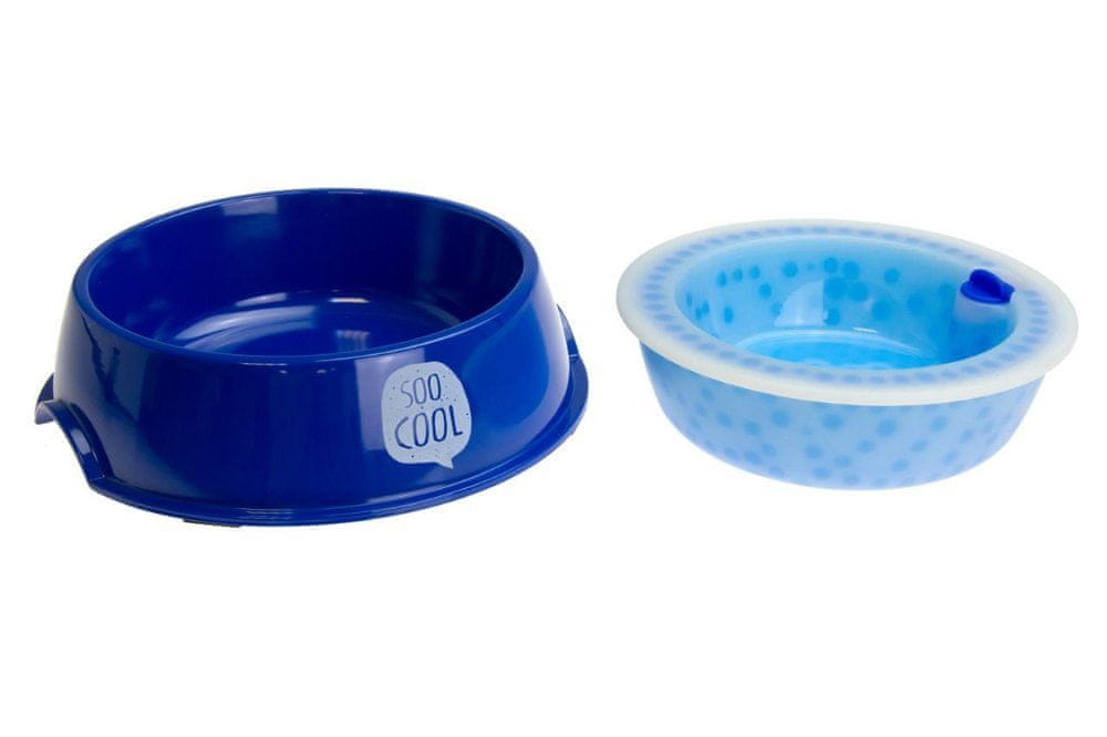 Modra plastična skleda z okrasnim potiskom „SOO COOL“ v zabavnem mehurčku je popoln pripomoček za tople poletne dni. Hladilni vložek v skledi je napolnjen s posebnimi kroglicami gela. Za ohladitev vložek postavite v hladilnik in ga nato vstavite v skledo. Hrana ali voda tako ostane prijetno hladna in sveža. Pri standardnih temperaturah lahko plastično posodo seveda uporabljate tudi brez hladilnega vložka. Štiri ravne gumijaste nogice zagotavljajo stabilnost in preprečujejo zdrs posode.