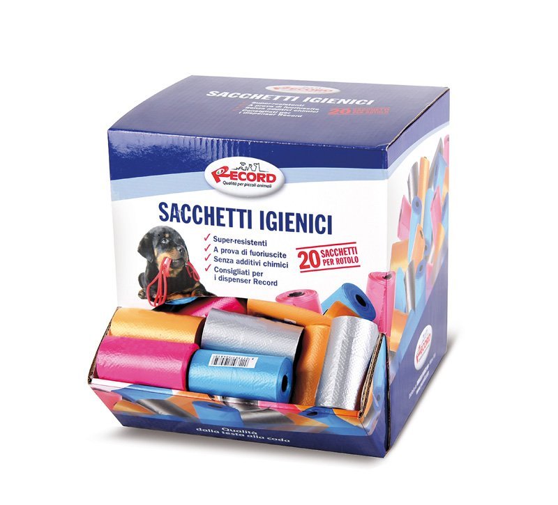 Roll robustnih vrečk za pasje iztrebke, ki se prilegajo večini podajalnikov in držal za vrečke. Rola vsebuje 20 vrečk za vse pasme. Različne barve. Velikost torbe: 27,5 × 30 cm.