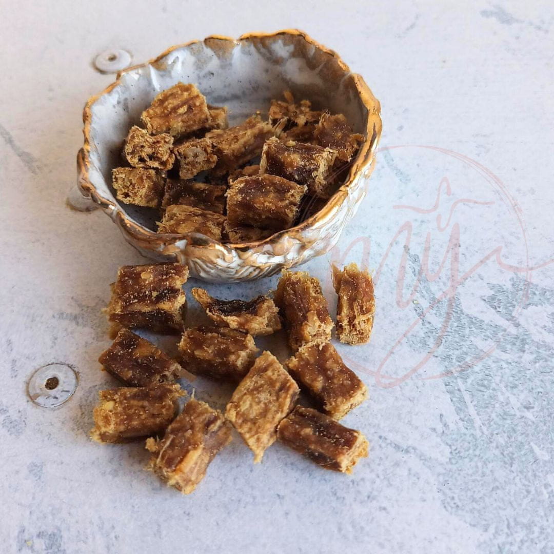 Kocke prekleto okusnih priboljškov se razlikujejo od priboljškov za trening, ki jih boste našli v večini trgovin. Namesto glicerina, ki povzroča prebavne težave, vsebujejo hladno stiskana rastlinska olja. To pomeni, da ostanejo precej mehki, a varni tudi za najbolj občutljive pasje trebuščke.