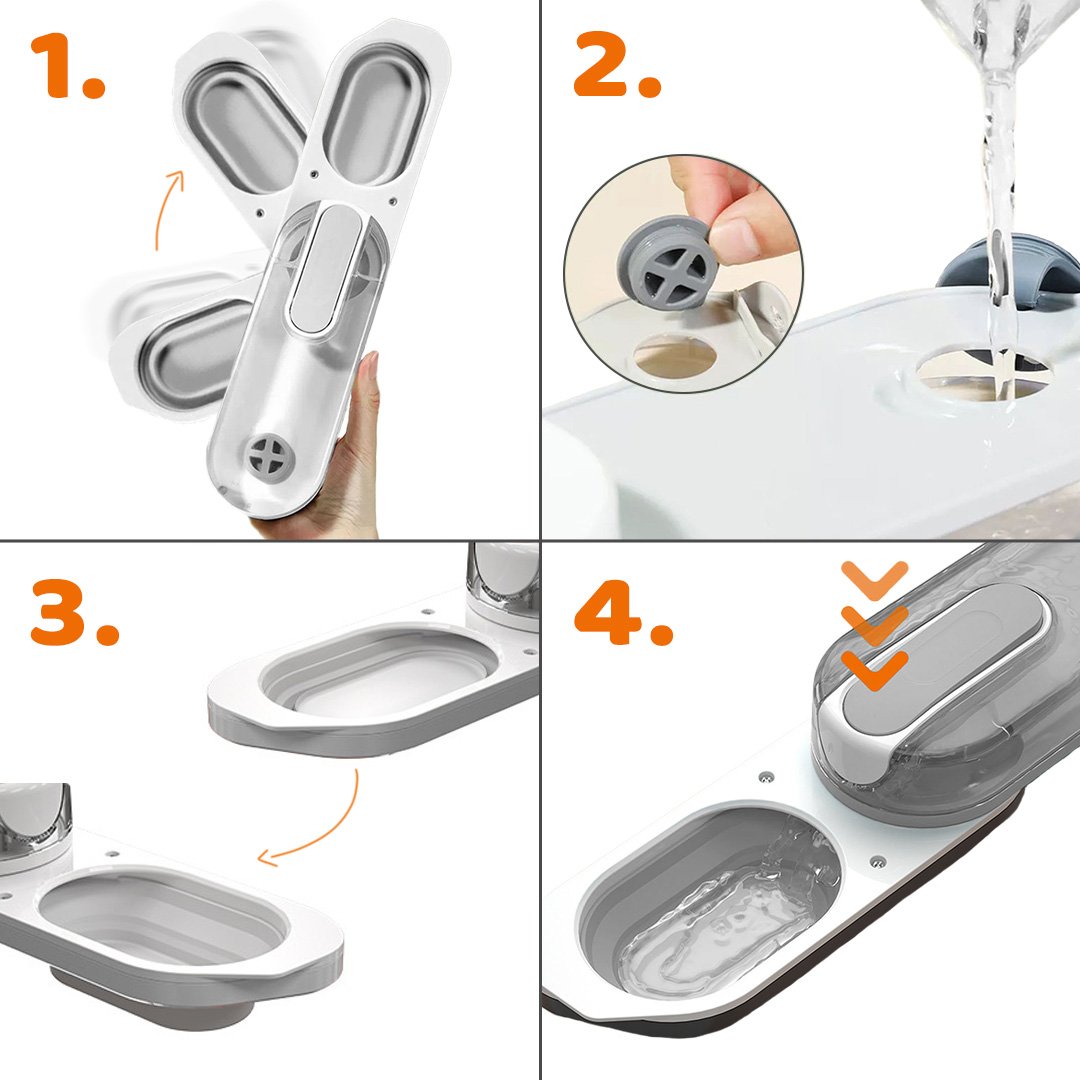 • Po pitju preostalo vodo zlijte stran, silikonsko posodo stisnite skupaj, da se splošči in zložite plastenko v prvotno obliko