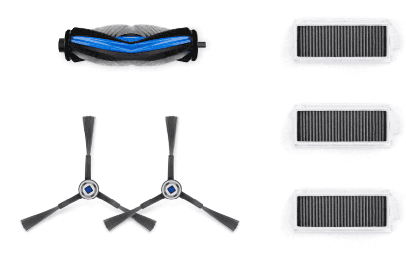 Ecovacs set dodatkov vključuje: 1× glavna krtača proti zapletanju, 4× stranska krtača in 3× antibakterijski filter. Dodatke je priporočljivo menjati vsakih 6 mesecev.