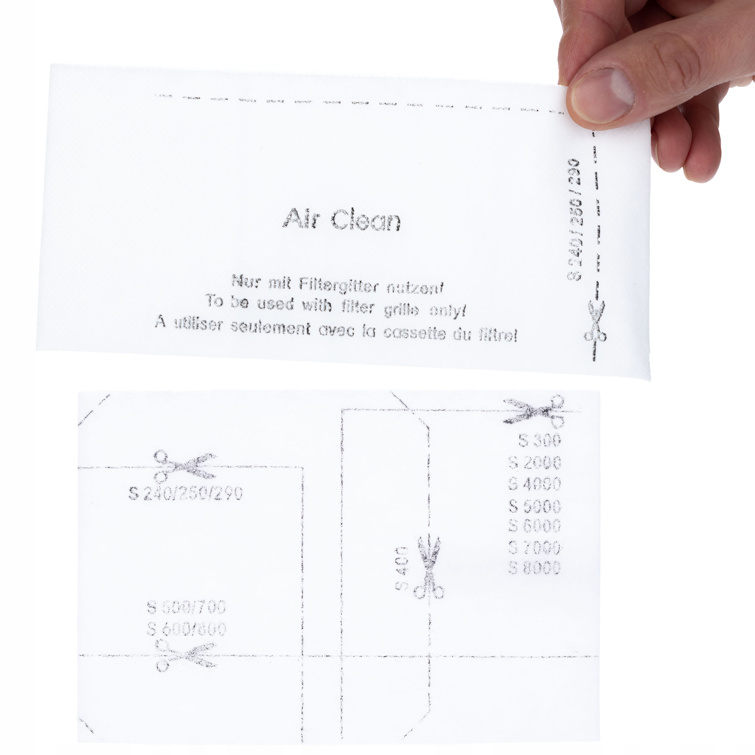 Univerzalni mikrofiltri:V kompletu dobite 1× vstopni filter in 1× izhodni filter, ki ju lahko prilagodite večini sesalnikov. Filtri morajo biti izrezani tako, da ustrezajo vašemu sesalniku.