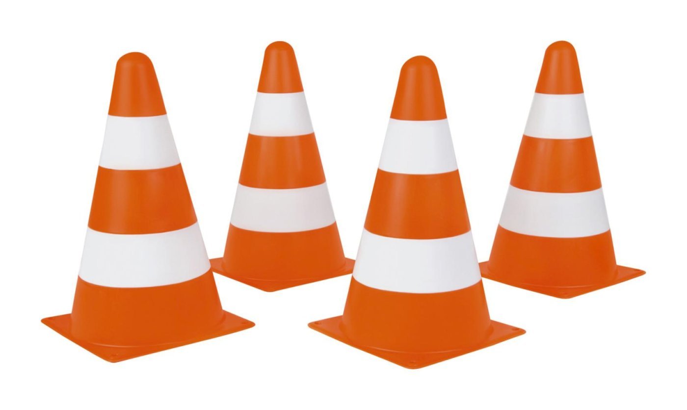 Komplet 4 prometnih stožcev, ki se lahko uporabljajo na primer na otroškem prometnem igrišču za učenje varnosti v cestnem prometu. Celoten opis