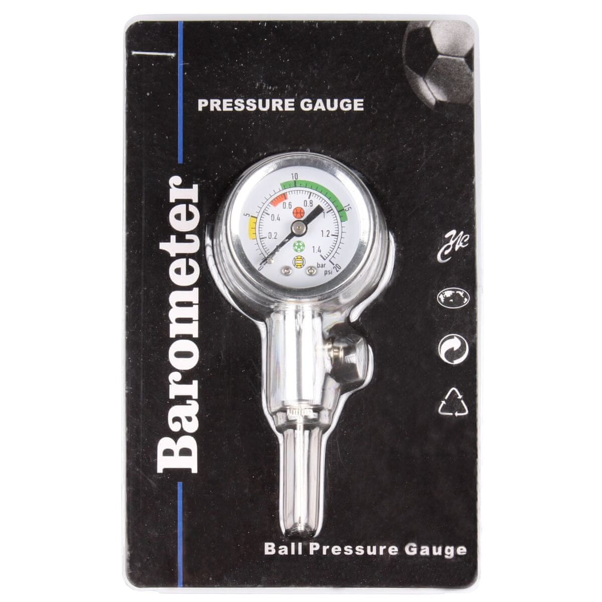 Kovinski merilnik tlaka z alarmom je praktično orodje, s katerim lahko hitro in preprosto izmerite tlak v vseh vrstah športnih žog. Iglo, ki je priložena v paketu, preprosto privijtena merilnik tlaka. Merilnik tlaka za žogo ima lestvico od 0 do 1,4 bara in od 0 do 20 psi. Lestvica je barvno označena s priporočenimi vrednostmi tlaka za osnovne vrste žog (odbojka, košarka, nogomet). Merilnik tlaka bi moral biti del osnovne opreme vsakega športnega kluba in vsake šole. Opozorilo: tlak v žogah vedno preverjajte le z navlaženim iglo, da ne poškodujete žoge!