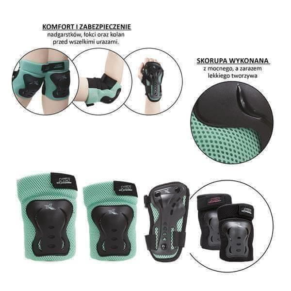 Ščitniki za zapestja, komolce in kolena H706 W Nils Extreme so izdelani iz visokokakovostnih materialov. Školjka je izdelana iz močne in lahke plastike. Ščitniki imajo zapiranje na ježka, ki jih drži na mestu. Oblika je zasnovana tako, da uporabniku zagotavlja maksimalno udobje in maksimalno zaščito pred poškodbami zapestij, komolcev in kolen. Komplet vsebuje: 2 ščitnika za zapestja, 2 ščitnika za komolce in 2 ščitnika za kolena. Specifikacije: Material: Najlon, Mreža, Pena Zapenjanje: Elastičen trak z ježkom Velikost: S Dimenzije (+/- 0,5 cm): Ščitnik za zapestja: 15×8 cm Ščitnik za komolce: 15,5×12,5 cm Ščitnik za kolena: 17×13 cm Barva: mint črna Embalaža: mrežasta prevleka Opombe: Ni namenjeno za komercialno uporabo Ustreza standardu PN_EN 14120:2003+A1 24-mesečna garancija