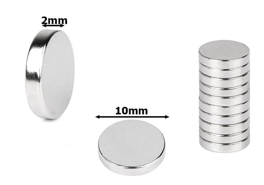 Magneti so zdelani so iz neodimovega železa, bora in železa, kar jim zagotavlja izjemno močno magnetno polje. S kompaktnimi dimenzijami 10×2 mm so enostavni za uporabo, vendar dovolj močni, da držijo tudi težje predmete.