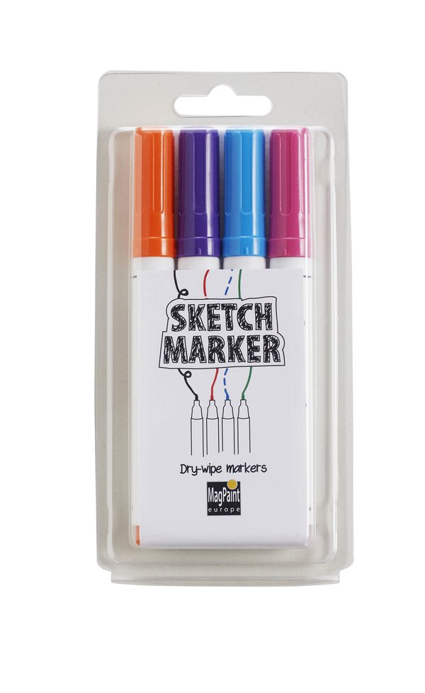 SketchSet vsebuje štiri nepermanentne markerje v oranžni, vijolični, roza in svetlo modri barvi, za pisanje na piši briši površinah, plastiki ali steklu. Markerji se lahko obrišejo suho ali s SketchCleaner čistilom za piši briši površine.
