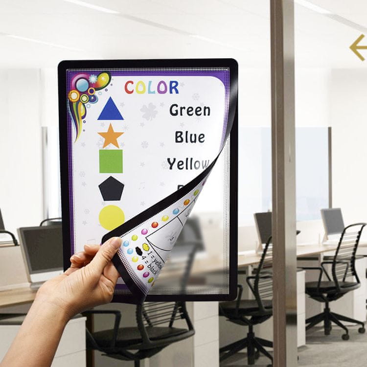 Samolepilna PVC magnetna mapa poskrbi za hitro in enostavno objavo ali odstranitev predstavljenih podatkov na A4 formatu. Prilepi se lahko na les, plastiko in kovino. Mogoče jo je odstraniti in znova uporabiti na drugi površini. Celoten opis