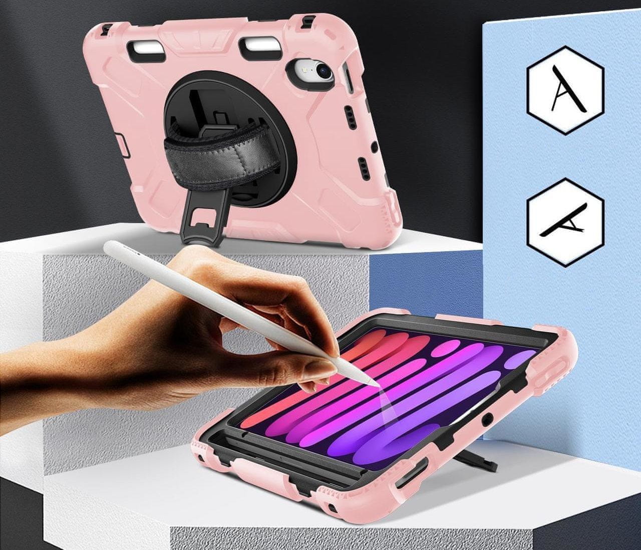 Nikcorp Vzdržljiv zaščitni ovitek za iPad Mini 6 8.3" z vrtljivim stojalom, ročajem in prostorom za pisalo, roza barve