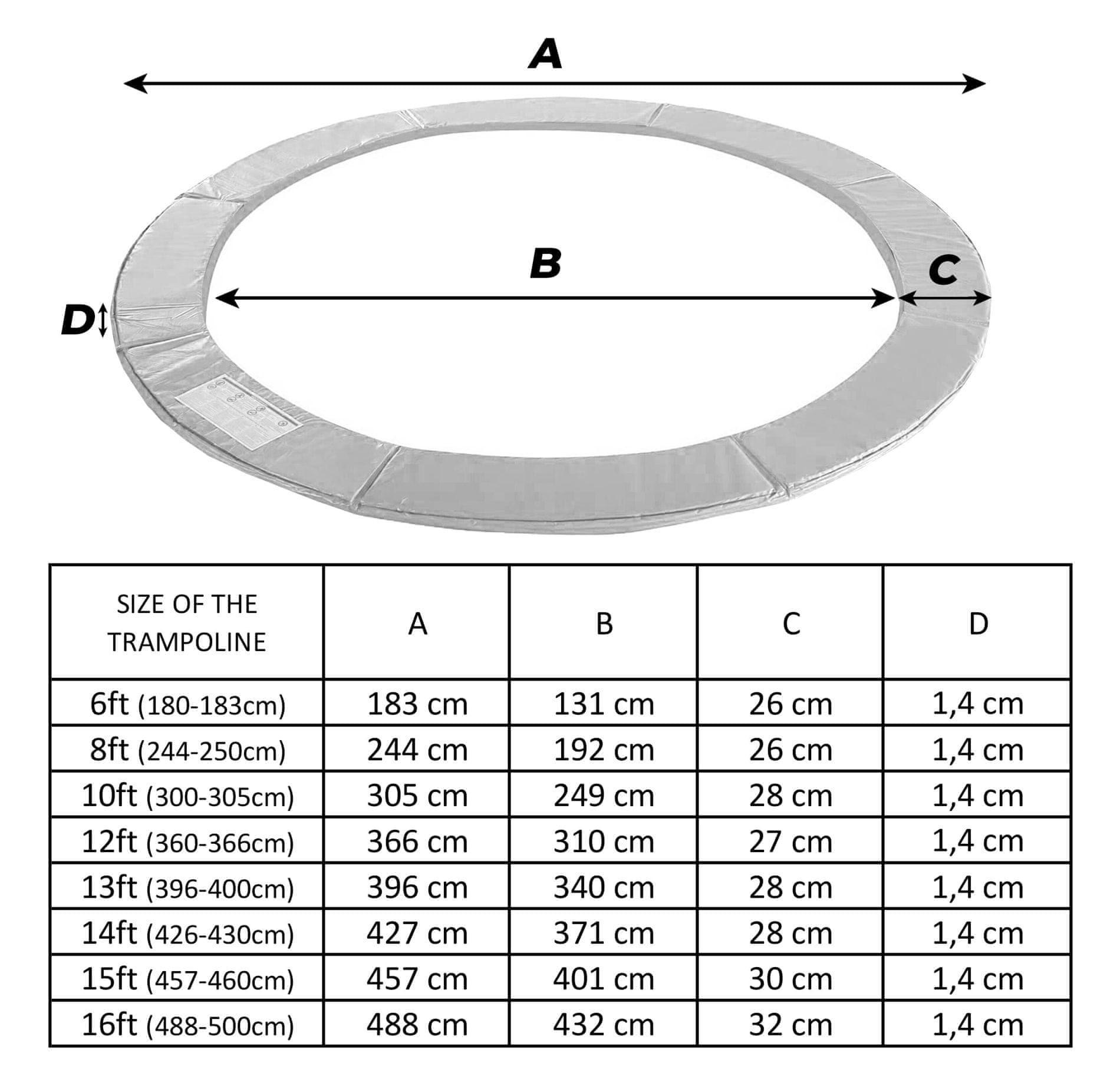 Specifikacije pokrova vzmeti AGA za trampoline 487, 488 in 500 cm (16 ft).