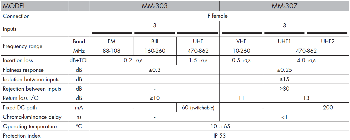 Stolpni diplekser, ki združuje signale UHF+VHF/BIII+FM iz ločenih anten. Zaprt v plastični škatli iz ABS. Priključki tipa F. Celoten opis