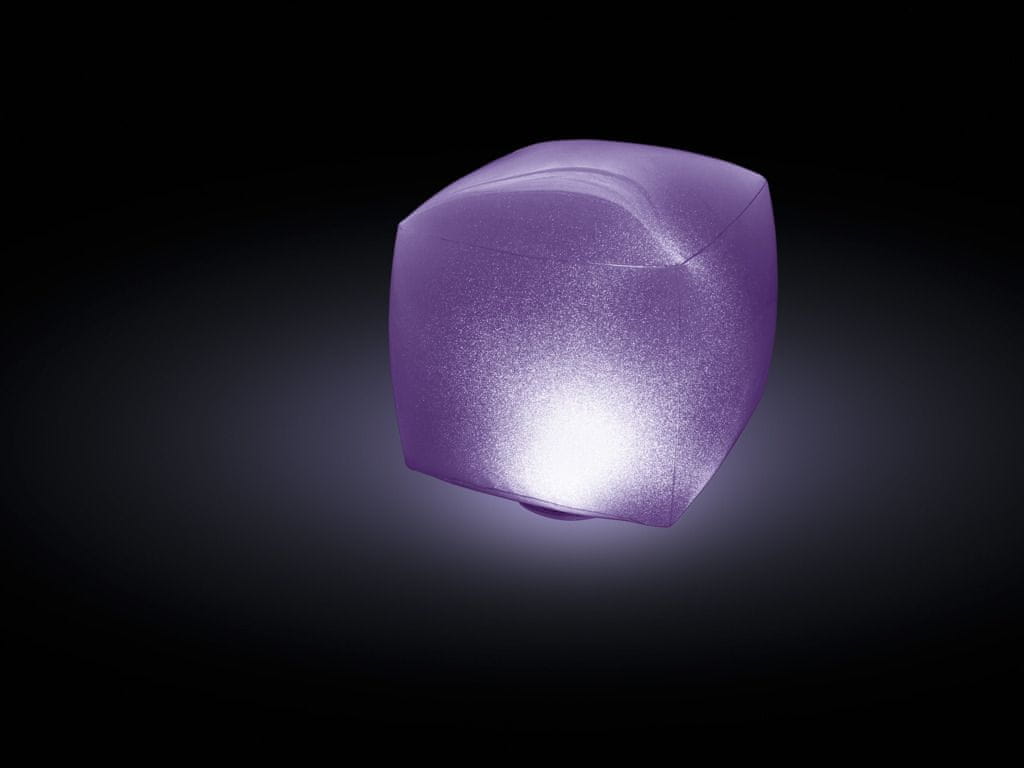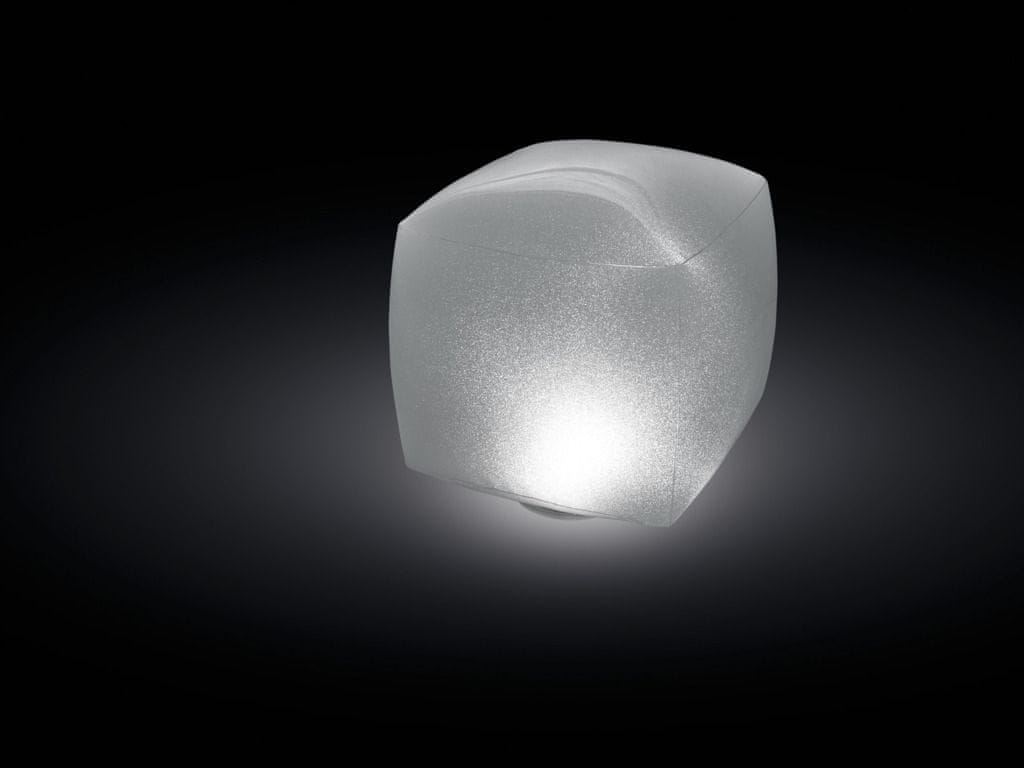 Napihljiva plavajoča kocka z LED osvetlitvijo, velikost 23 cm x 23 cm x 22 cm. Sveti v 4 različnih barvah. Možnost nastavitve 2 načinov – enakomerna barva ali spreminjanje barv. Priložen je popravni obliž. Izdelana iz visokokakovostnega vinila.