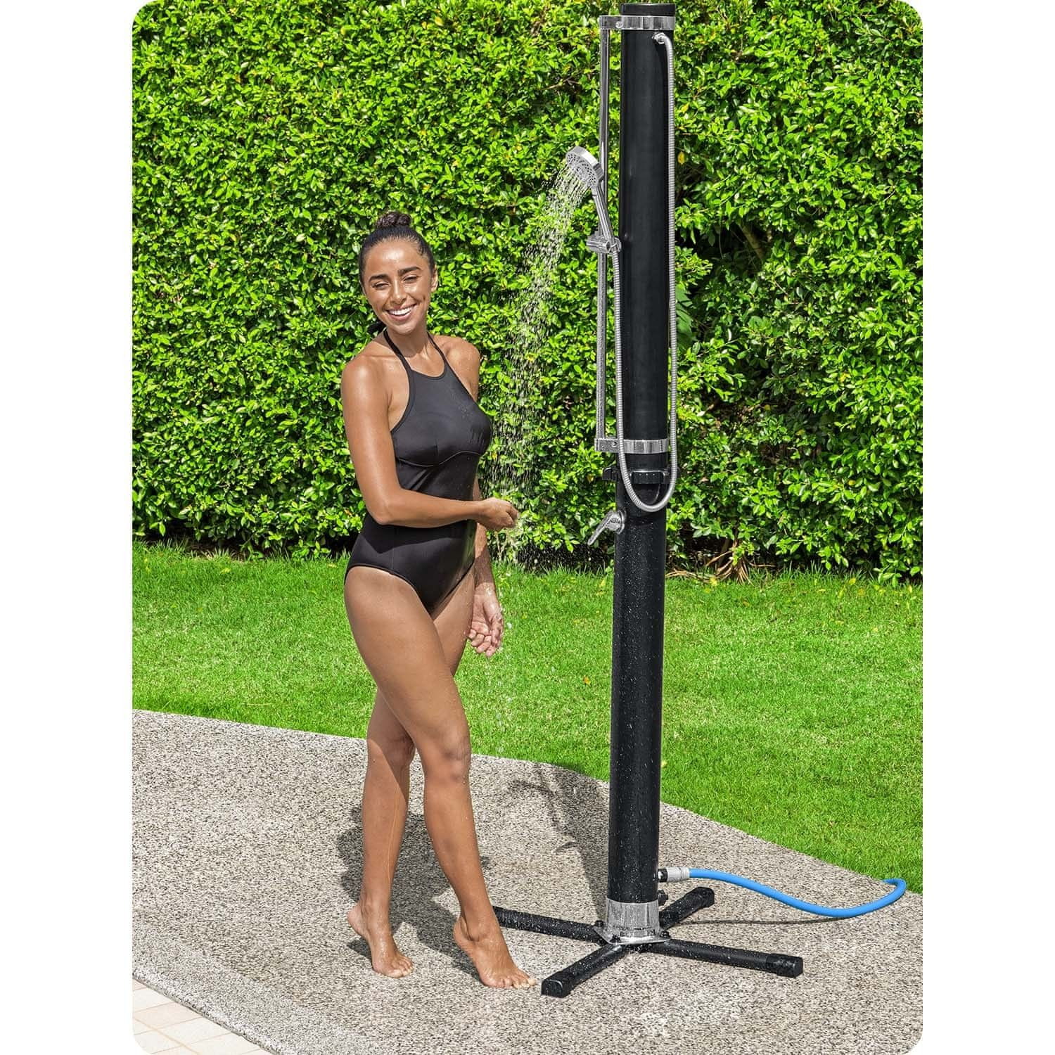 Poleg tega lahko rezervar za vodo sprejme do 20 litrov vode, ki se zaradi barve in dizajna tuša lahko ogreje s sončnimi žarki.