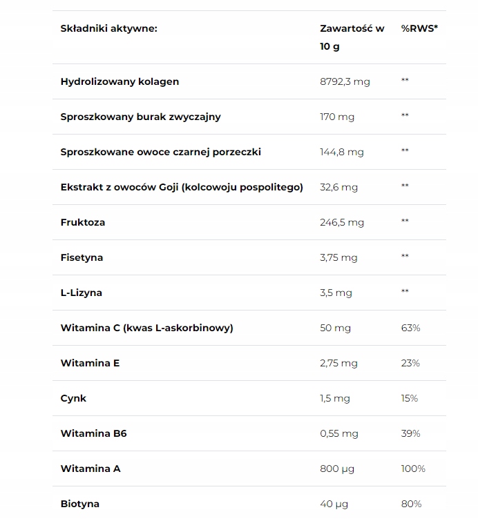 Peptiplus® hidroliziran kolagen (97 % kolagenskih beljakovin), regulator kislosti: citronska kislina, aroma (črni ribez), fruktoza, prah rdeče pese (Beta vulgaris), prah plodov črnega ribeza (Ribes nigrum), izvleček plodov volčje jagode (Lycium barbarum, Goji), vitamin C, vitamin E; fisetin, L-lizin, cink, vitamin B6, vitamin A, biotin.