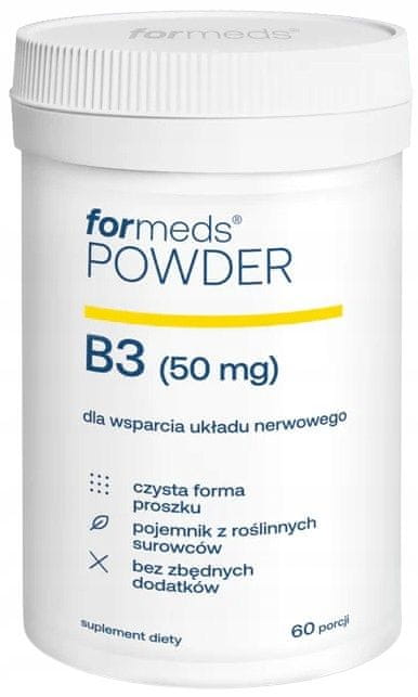 B3 50 mg 60 odmerkov Prehransko dopolnilo Nova različica F-vit B3, visoko absorbirajoče oblike nikotinamida, dopolnjene z nikotinsko kislino Podpira živčni sistem Ohranja normalne psihološke funkcije Zmanjšuje utrujenost in izčrpanost Za normalen metabolizem energije Za pravilno stanje sluznic Brez nepotrebnih dodatkov Čista praškasta oblika Merica v vsakem pakiranju Visoki odmerki Visoka biološka uporabnost Vegansko Navodila za uporabo Pred uporabo posodo močno pretresite. 1 odmerek (1 ravno merico) stresite v suho posodo. Dodajte 200 ml vode ali druge pijače in premešajte Opomba – upoštevajte vrstni red priprave, da se prašek temeljito raztopi. Zaužijte enkrat na dan z obrokom. Sestavine Inulin (koren cikorije), niacin (nikotinamid, nikotinska kislina). Priporočeni dnevni odmerek (0,67 g) vsebuje (% PDV): Niacin (B3) (NE) – 50 mg (313 %), vključno z: – nikotinamid – 34 mg – nikotinska kislina – 16 mg Inulin 620 mg*PDV – Referenčni vnosNE – ekvivalent niacina Previdnostni ukrepi: Ne prekoračite priporočenega dnevnega odmerka. Ta izdelek je namenjen odraslim in ga nosečnice ali doječe matere ne smejo uporabljati brez posveta z zdravnikom. Ta izdelek se ne sme uporabljati kot nadomestilo za raznoliko prehrano. Ne uporabljajte, če ste alergični na katero koli sestavino. Priporočamo uravnoteženo prehrano in zdrav način življenja. Ta izdelek lahko povzroči vroče oblive, rdečico in srbenje obraza in telesa. Neto teža: 60 obrokov Prehranskih dopolnil se ne sme uporabljati kot nadomestilo za raznoliko prehrano ali zdrav način življenja. Ne prekoračite priporočenega dnevnega odmerka. Prehranska dopolnila shranjujte izven dosega majhnih otrok. Pred uporabo tega izdelka priporočamo, da preberete podrobne informacije na embalaži ali priloženem navodilu. Pogoji shranjevanja: Hranite v tesno zaprti posodi. Na hladnem in suhem mestu, izven dosega otrok. Zaščitite pred svetlobo. Proizvajalec: FormedsGrunwaldzka 18460–166 Poznań