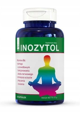 AZ INOZYTOL 45 kapsul NETO TEŽA 32 g Prehransko dopolnilo z inozitolom vsebuje vitamin B6, ki podpira pravilno delovanje živčnega sistema in zmanjšuje utrujenost in izčrpanost. Uporaba: dopolnjevanje prehrane z aktivnimi sestavinami pripravka. Priporočen dnevni vnos: odrasli 1 kapsula 1–2-krat na dan, najbolje po obroku, s tekočino. Sestavine: inozitol, kapsula (želatina, voda, barvili – E171, E172), vitamin B6 (piridoksin hidroklorid), maltodekstrin, sredstvo proti sprijemanju – E470b. 1 kapsula vsebuje: 500 mg inozitola, 0,7 mg vitamina B6 (50 %)*. *NRV – Referenčni vnos.