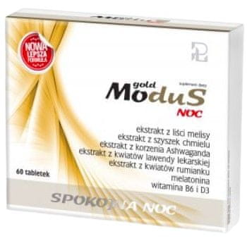 Modus Gold Night 60 tablet: Prehransko dopolnilo MOODUS Gold Night je mešanica visokokakovostnih vitaminov in rastlinskih sestavin, priporočljiva za razdražljive in stresne posameznike, ki imajo težave s spanjem. MOODUS GOLD NIGHT vsebuje izvlečke listov melise, hmeljevih storžkov, korenine ašvagande, cvetov sivke in cvetov kamilice ter vitamine B6, D3 in melatonin. Melatonin pomaga skrajšati čas, potreben za zaspanje – koristen učinek se doseže z zaužitjem 1 mg melatonina tik pred spanjem. Poleg tega melatonin pomaga ublažiti subjektivni občutek časovne razlike – koristen učinek se doseže z zaužitjem 0,5 mg tik pred spanjem prvi dan potovanja in v naslednjih nekaj dneh po prihodu na cilj. Poleg tega vitamin B6 prispeva k zmanjšanju utrujenosti in izčrpanosti ter pomaga pri pravilnem delovanju živčnega sistema. Poleg tega vitamin B6 skupaj z vitaminom D podpira pravilno delovanje imunskega sistema. Aktivne sestavine: Suhi izvleček listov melise (Melissa officinalis) Suhi izvleček hmeljevih storžkov (Humulus lupulus) Suhi izvleček korenine ašvagande (Withania somnifera) Suhi izvleček cvetov sivke (Lavandula officinalis) Suhi izvleček cvetov kamilice (Matricaria Reutita) Vitamin B6 (piridoksin hidroklorid) Melatonin Vitamin D3 (holekalciferol) Priporočen dnevni vnos: 1–2 tableti, vzeti tik pred spanjem. Sestavine: Sredstva za povečanje prostornine, suhi izvleček listov melise, suhi izvleček hmeljevih storžkov, suhi izvleček korenine ašvagande, krompirjev škrob, suhi izvleček cvetov sivke, suhi izvleček cvetov kamilice, vlažilna sredstva, sredstvo proti sprijemanju – magnezijeva sol maščobne kisline – magnezijev stearat, vitamin B6, (piridoksin hidroklorid, melatonin, vitamin D3).