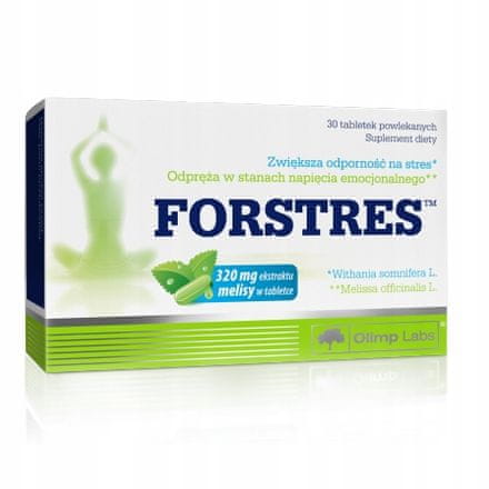 Forstres 30 kapsul Podpora telesu v obdobjih živčne napetosti in tesnobe (izvleček ašvagande KSM-66®) Pomoč pri povečanju odpornosti telesa na stres (izvleček ašvagande KSM-66®) Blagodejni učinek na ohranjanje duševnih in telesnih sposobnosti v stanjih šibkosti, izčrpanosti, utrujenosti in izgube koncentracije (izvleček ašvagande KSM-66®) Sproščujoč učinek v stanjih čustvene napetosti (izvleček listov melise) Pomoč pri ohranjanju normalnih psiholoških funkcij (magnezij, vitamin B6) Olimp Forstres® je prehransko dopolnilo v obliki filmsko obloženih tablet, ki vsebuje mešanico visokokakovostnih rastlinskih izvlečkov, ki podpirajo telo v stresnih situacijah. Ta izdelek, razvit v sodobnih laboratorijih raziskovalno-razvojnega centra farmacevtskega podjetja Olimp Laboratories, je dodatno dopolnjen z magnezijem in vitaminom B6. Kako deluje Olimp Forstres®? Prehransko dopolnilo Olimp Forstres® je bilo ustvarjeno za ljudi, ki živijo pod pritiskom, vodijo intenziven življenjski slog in so vsakodnevno izpostavljeni stresu. Izvleček ašvagande KSM-66®, ki ga vsebuje formula, kaže adaptogene lastnosti in zagotavlja odlično podporo telesu v obdobjih živčne napetosti in tesnobe, saj povečuje njegovo odpornost na stres. Prav tako spodbuja čustveno ravnovesje in dobro počutje, podpira spomin in učne sposobnosti ter ohranja duševne in telesne sposobnosti v stanjih šibkosti, izčrpanosti, utrujenosti in izgube koncentracije. Izvleček listov melise pa ima sproščujoče in pomirjujoče lastnosti v stanjih nestrpnosti, razdražljivosti in čustvene napetosti. Pomaga ohranjati pozitivno razpoloženje in kognitivne funkcije ter podpira ustrezno telesno in duševno stanje. Magnezij in vitamin B6 pa zagotavljata pravilno psihološko delovanje in pravilno delovanje živčnega sistema. Obe sestavini prispevata tudi k zmanjšanju utrujenosti in izčrpanosti. Sestavine: magnezijev malat, izvleček listov melise (Melissa officinalis L.), sredstvo za povečanje prostornine – mikrokristalna celuloza; izvleček ašvagande KSM-66® (Withania somnifera L.), glazirna sredstva – polivinil alkohol, polietilen glikol, smukec; sredstvo za povečanje prostornine – zamrežena natrijeva karboksimetilceluloza; sredstva proti sprijemanju – magnezijeve soli maščobnih kislin, silicijev dioksid; piridoksin hidroklorid – vitamin B6; barvila – titanov dioksid, briljantno modro FCF, železovi oksidi in hidroksidi.