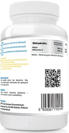Kalcij + vitamin C 120 kapsul Inovativna receptura – sodobna formula, ki izstopa med drugimi izdelki po svoji sestavi. 100 % varno – izdelek je optimiziran glede varnosti uporabljenih pomožnih sestavin. Brez umetnih polnil – sestava kapsul ne vsebuje snovi, kot so magnezijeve soli maščobnih kislin (magnezijev stearat), kalcijev hidrogenfosfat, silicijev dioksid, mikrokristalna celuloza. Priporočljivo za ljudi: tiste, ki intenzivno trenirajo, tiste, ki fizično delajo, in tiste, ki živijo v onesnaženem okolju. 100 % čisto – brez škroba, brez soli, brez sladkorja, ne vsebuje glutena, jajc, soje, mlečnih beljakovin in laktoze. Kalcij: Potreben je za ohranjanje zdravih kosti. Potreben je za ohranjanje zdravih zob. Pomaga pri pravilnem delovanju mišic. Vitamin C: Pomaga pri ohranjanju normalnih psiholoških funkcij. Pomaga pri pravilnem delovanju imunskega sistema. Pomaga zaščititi celice pred oksidativnim stresom. Prispeva k zmanjšanju utrujenosti in izčrpanosti. Pomaga pri regeneraciji reducirane oblike vitamina E. Poveča absorpcijo železa. Navodila za uporabo: Vzemite dve kapsuli enkrat na dan. Ne prekoračite priporočenega dnevnega odmerka. Sestavine: kalcijev karbonat, vitamin C (L-askorbinska kislina), kapsula (želatina – ovojnica kapsule)