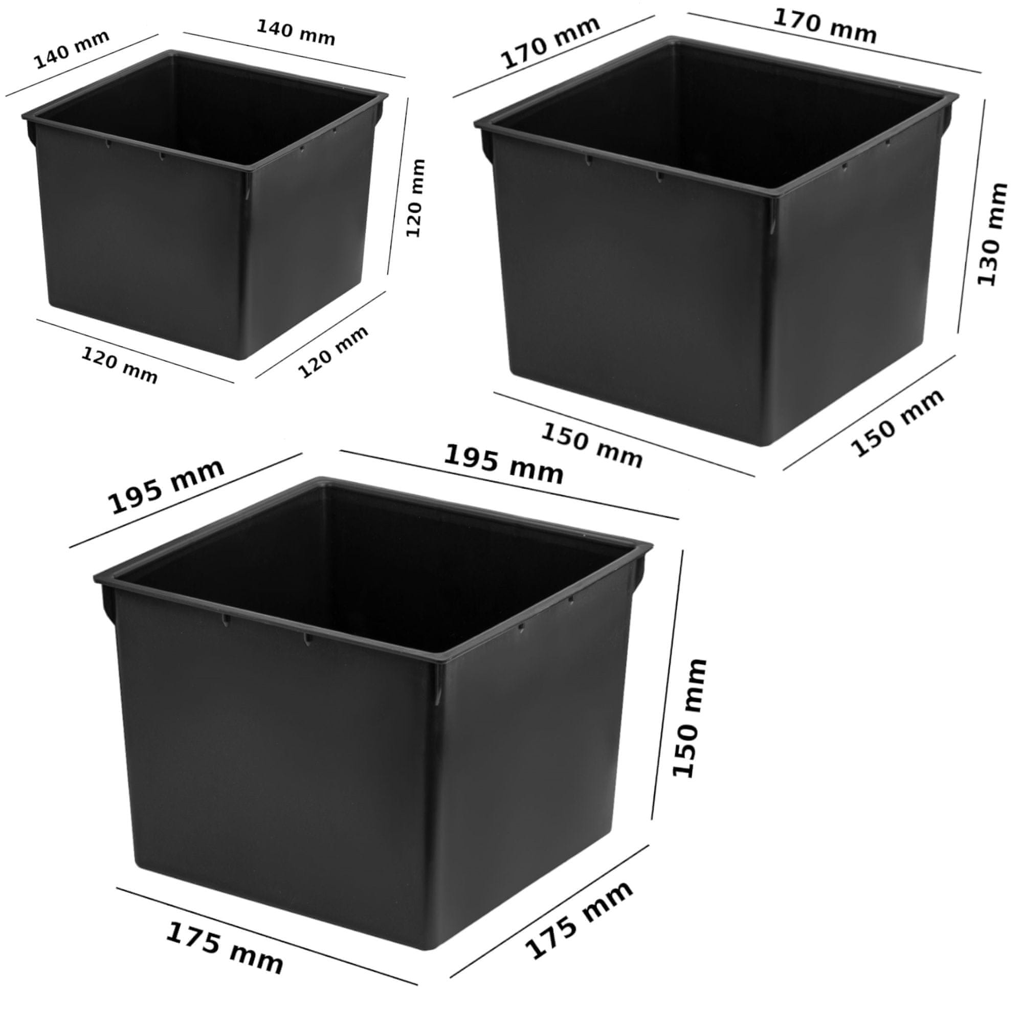 Komplet vložkov za cvetlične lončke v črni barvi. Visokokakovostna plastika trapezne oblike. Optimalna vlažnost in zaščita rastlin pred prelivanjem. Idealna rešitev za vaše rastline. Celoten opis