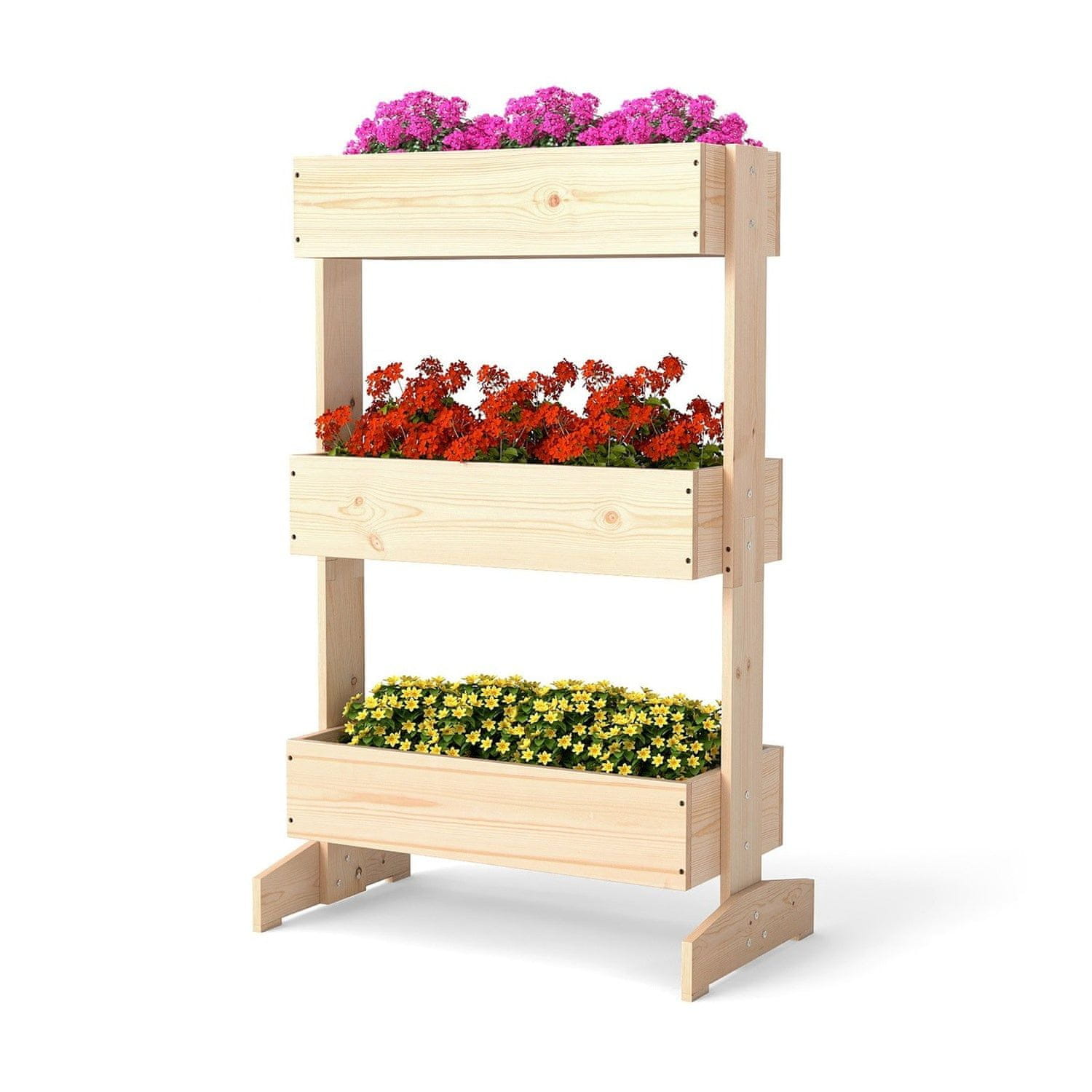 Vertikalni vrtni sadilnik s 3 nivoji iz naravnega borovega lesa omogoča enostavno gojenje rastlin v omejenem prostoru. Idealno za zelenjavne vrtnine, zelišča in rože. Kompaktna zasnova vključuje 3 ločene škatle za sajenje, primeren za zunanjo in notranjo uporabo. Celoten opis