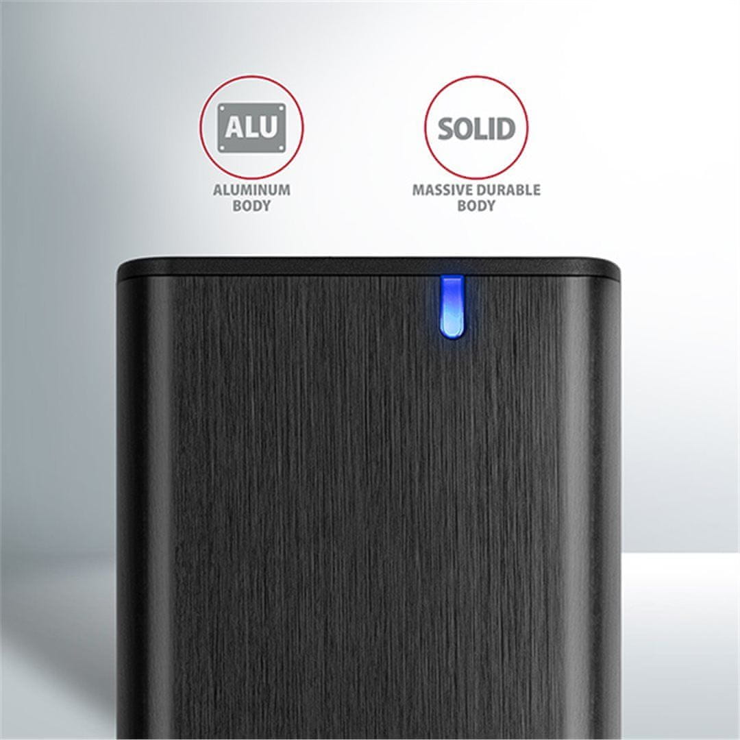 Zunanje kovinsko ohišje je izdelano v črni barvi z elegantnim brušenim zaključkom, ki preprečuje nezaželene prstne odtise. Zaobljena oblika ohišja obljublja prijetno uporabo. Aluminijasto ohišje ohišja in prezračevalne odprtine zagotavljajo zelo dobro hlajenje vstavljenega M.2 SSD.