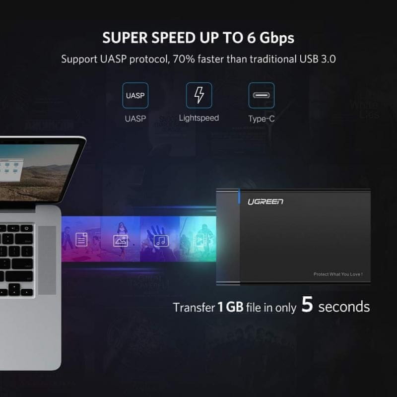 UGREEN USB C 2.5" ohišje za trde diske nudi preprosto uporabo vaših trdih diskov. Trdi disk varuje pred morebitnimi praskami in poskrbi da lahko vaš Sata trdi disk uporabljate kot prenosni disk.