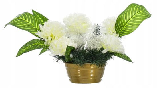 STROIK NA HROBU KW-903012 Čudovita nagrobna kompozicija, trdno izdelana na okrasnem lončku, napolnjenem z obteženim materialom. Naglavni trak okrašen s 5 umetnimi cvetovi in dodatno pentljo iz umetnih vejic božičnega drevesa Celoten opis