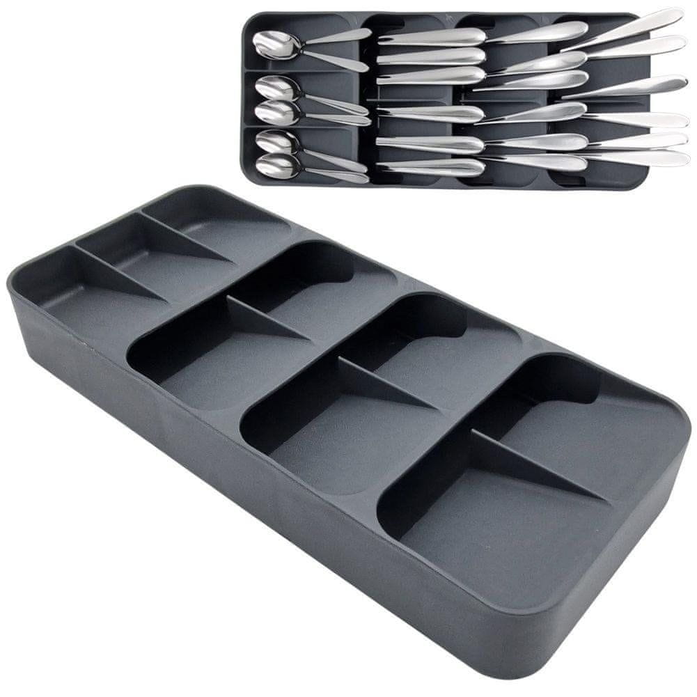 • Organizator za jedilni pribor za organizacijo pribora v predalu – Izdelan iz trpežne sive plastike – Opremljen z 9 predali – Zasnovan tako, da zavzame zelo malo prostora, vendar je izjemno prostoren – Idealen za shranjevanje žlic, vilic, nožev, majhnih žlic in vilic – Specifikacije: Material: plas