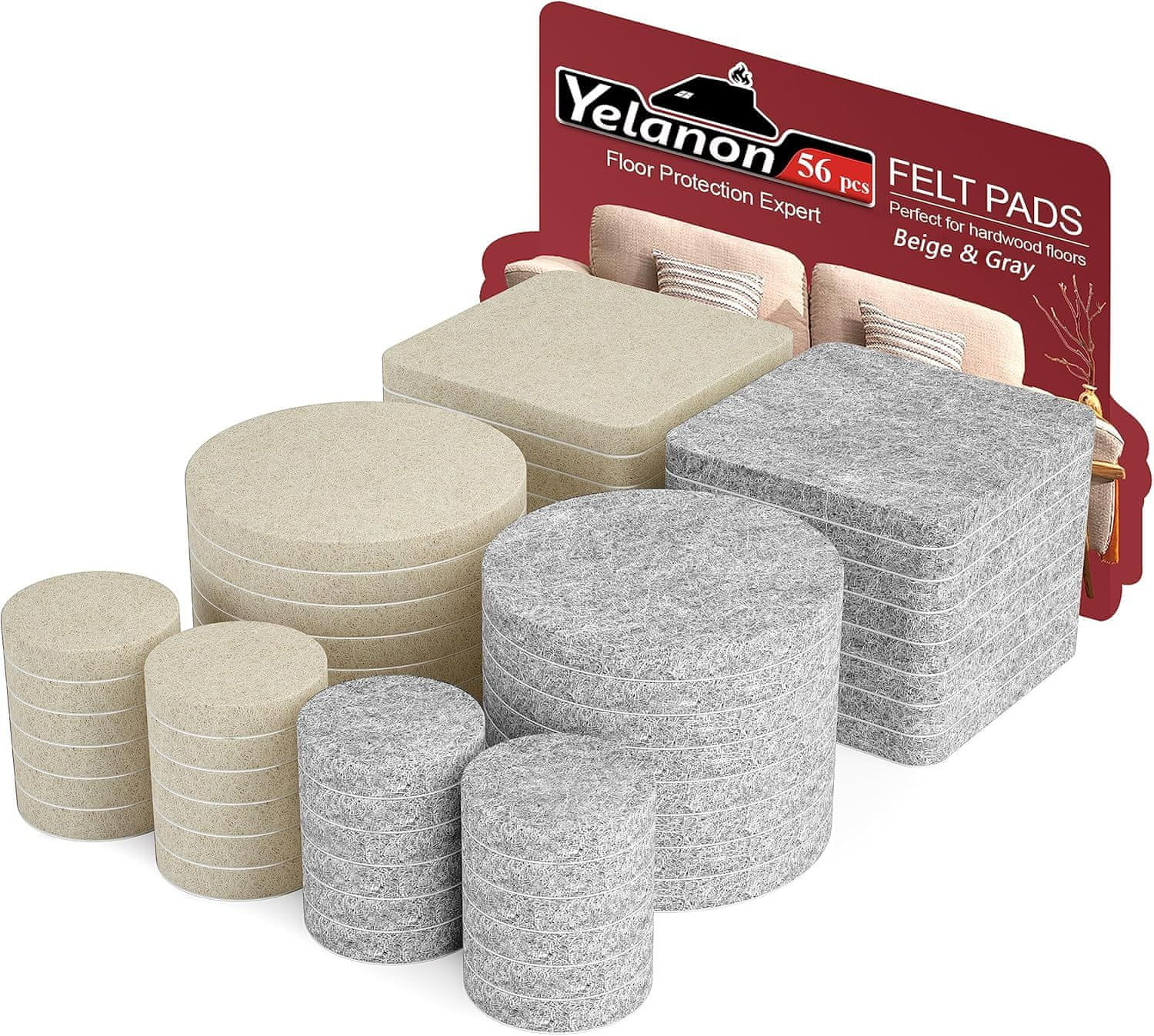 Komplet filcastih pohištvenih podlog Yelanon je zanesljiva rešitev za vsakogar, ki želi zaščititi svoja tla pred praskami, hrupom in sledmi premikanja pohištva. V kompletu je kar 56 kosov samolepilnih podlog v treh velikostih in dveh barvah – bež in sivi – kar omogoča prilagajanje različnim vrstam pohištva in notranji opremi. Podloge so izdelane iz filca visoke gostote, ki zagotavlja trajnost in učinkovito zaščito. Primerne so za uporabo na nogah stolov, miz, postelj, kavčev, omar in drugih naprav, ščitijo lesena, laminatna ali ploščična tla pred poškodbami in neprijetnim zvokom praskanja.