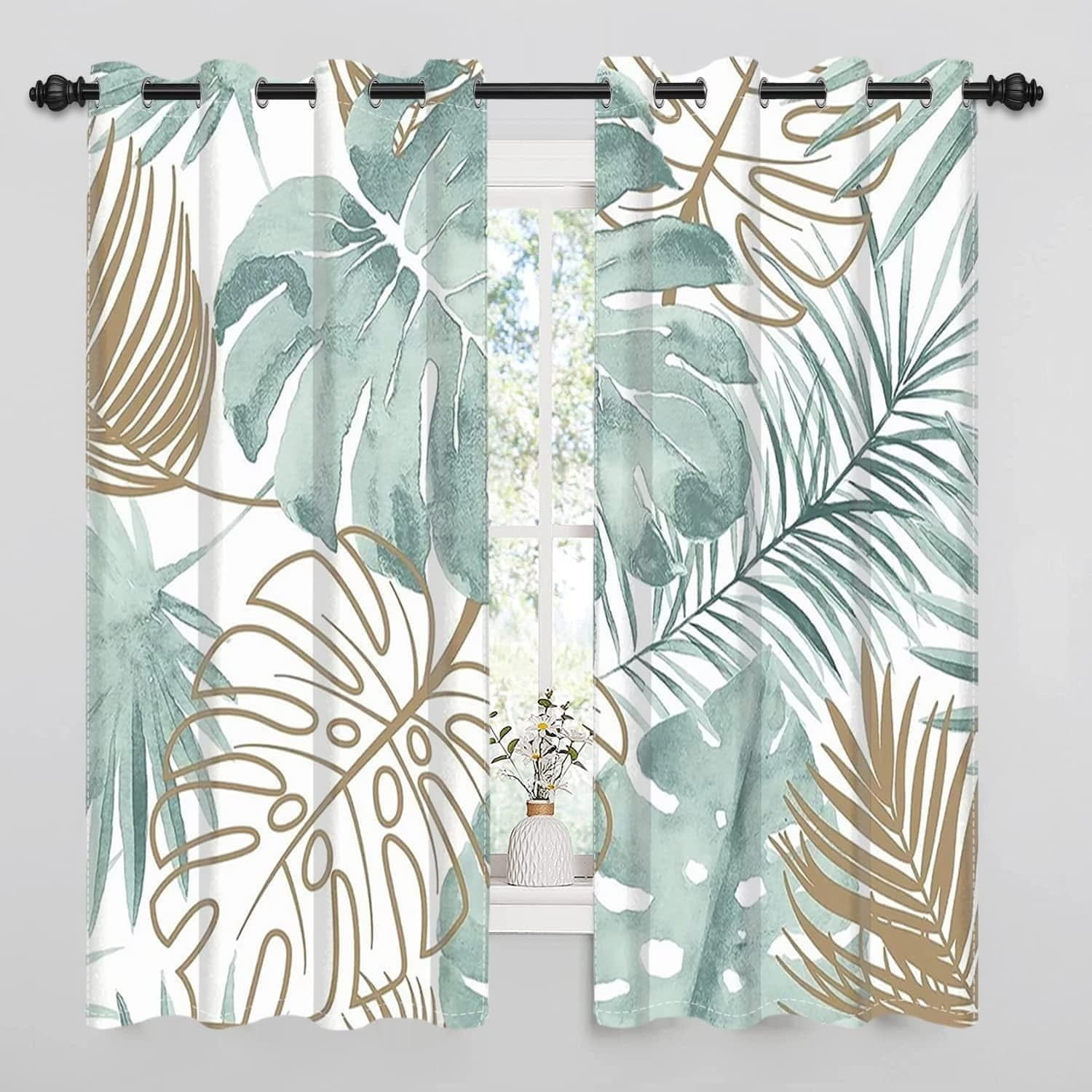 Nikcorp Zatemnitvene zavese za dnevno sobo, motiv tropske palme, bele, 2 kosa, 140 x 245 cm, zatemnitev in toplotna zaščita