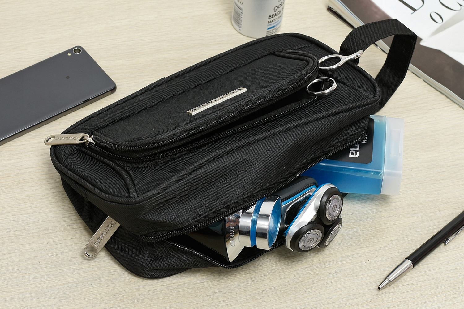 ✅ Moška potovalna kozmetična torbica ima en prostoren predal in en sprednji žep, zaprt z zadrgami z udobnimi, brušenimi ročaji v srebrni barvi.