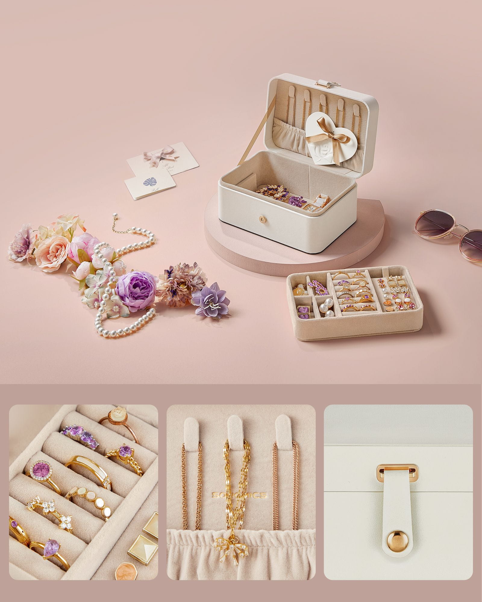 Ta kompakten nakitni etui je zasnovan za popotnike in tiste ki želijo svoje dodatke organizirati na poti. Z dvema nivojema shranjevanja ponuja dovolj prostora za različne vrste nakita hkrati pa ohranja prenosno in lahko obliko. Njegov eleganten videz in praktična razporeditev ga naredijo idealnega tako za vsakodnevno uporabo kot za potovanja.