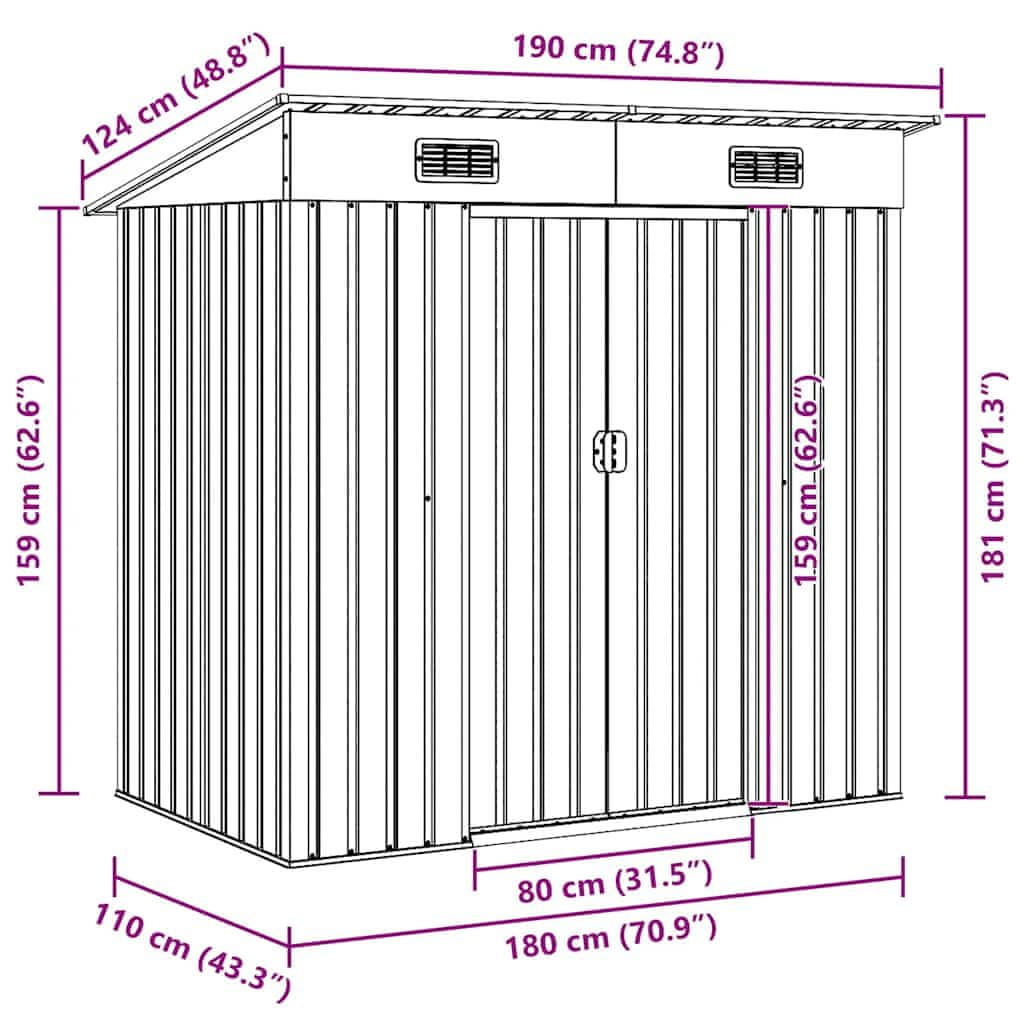 • Praktična zasnova: Ta shramba je opremljena z odprtinami, ki zagotavljajo odlično prezračevanje in zmanjšujejo kopičenje vlage in vonjav v hiši. Dvojna drsna vrata na sprednji strani omogočajo enostaven vstop in izstop.
