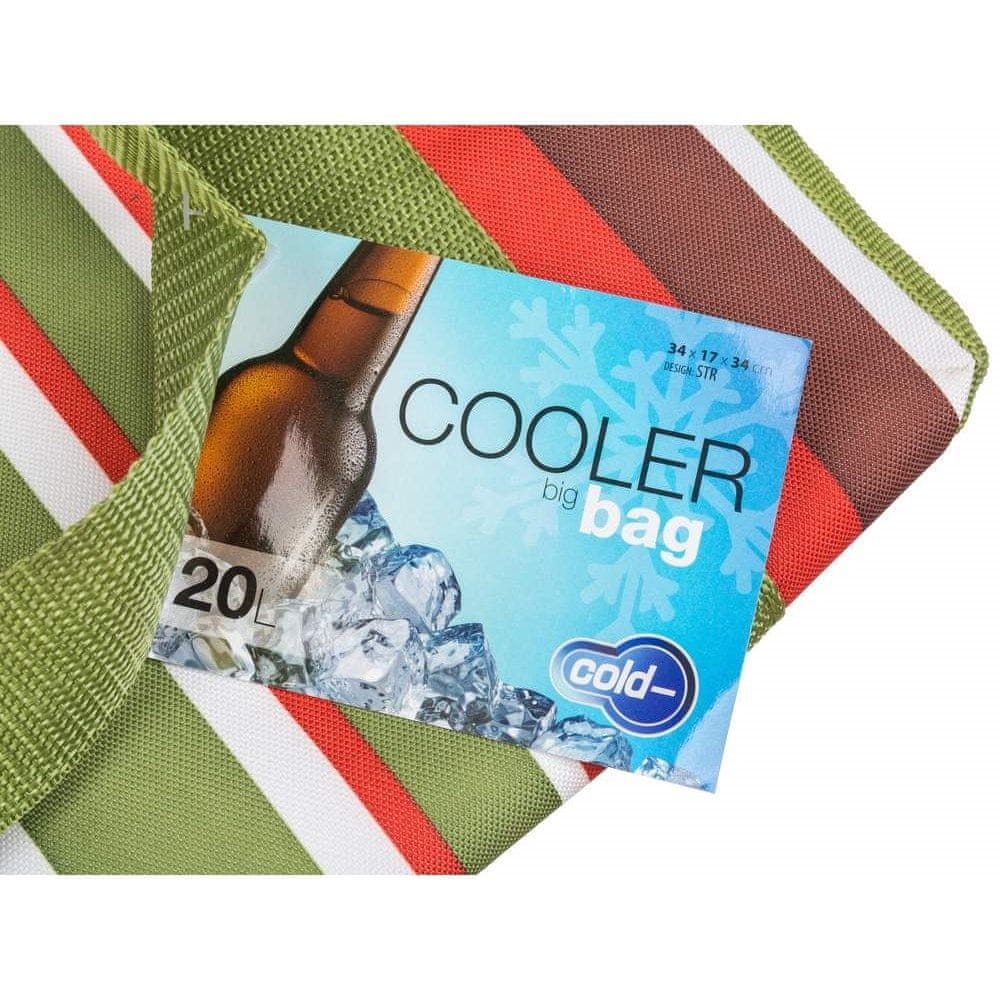Hladilna torba velika 20 l – dekor STR, zelena z barvnimi črtami. Zunanji material – visoko odporen poliester, notranji material – izolacijska plast PE pene. Zaradi notranjih gladkih sten ga je zelo enostavno vzdrževati in čistiti v primeru kontaminacije živil. Celoten opis