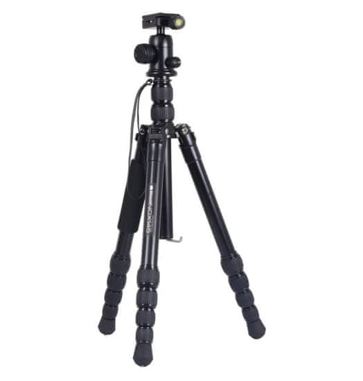 Profesionalni aluminijasti stativ z nosilnostjo do 8 kg in nastavljivo višino od od 51 do 145 centimetrov. Ima panoramično kroglično glavo z zamenljivima ploščama z navojem 1/4" in 3/8", nastavljivim trenjem in dvema niveloma za natančno usmerjanje. Noge z vrtljivim zaklepom so sestavljene iz petih segmentov in jih je mogoče obrniti za 180° za minimalno višino nagiba. Tudi sredinski steber je mogoče obrniti za 180°, kar boste še posebej cenili pri makro posnetkih. Poleg tega so opremljeni z gumijastimi nogicami in nastavljivimi konicami. Priložen je priročen kovček za prenašanje.
