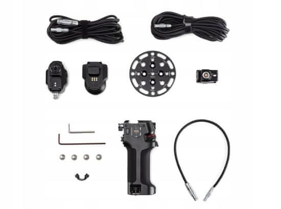 Komplet vključuje ročaj za daljinsko upravljanje, ki vam omogoča upravljanje parametrov kamere in ostrenje, nadzor zaklopa ter premikov gimbala. Univerzalno stojalo DJI Ronin in adapter za baterije napajata DJI RS 2.