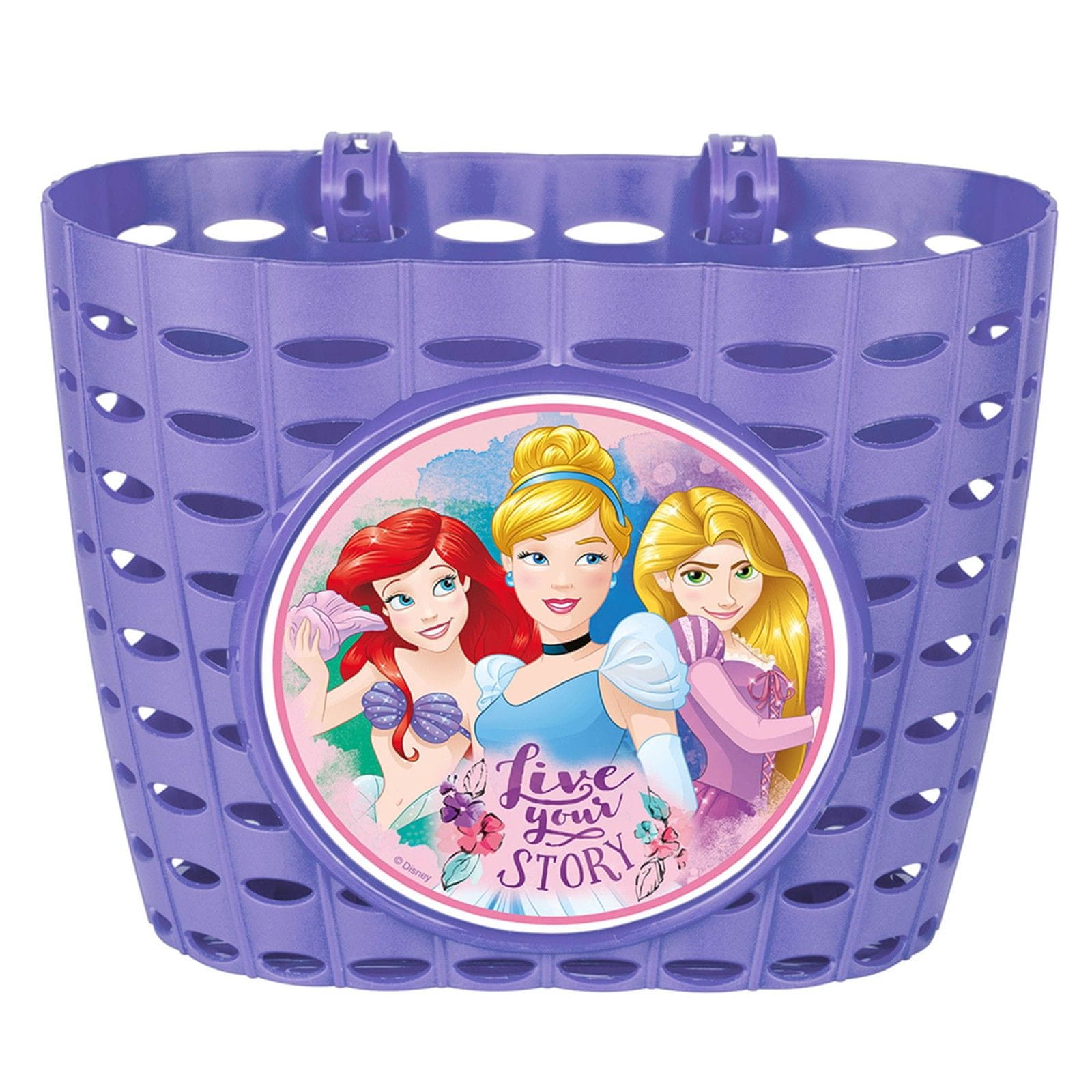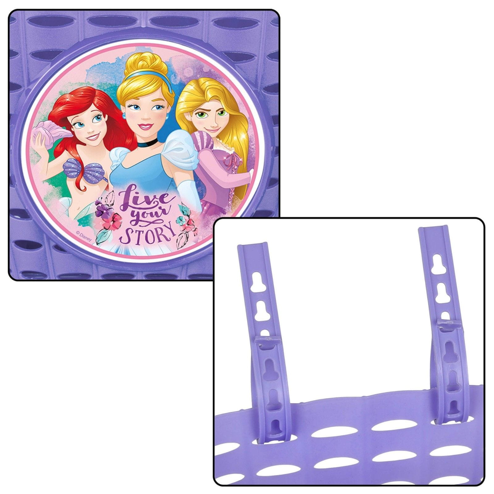 Kolesarska košara z motivom princesk Ariel, Pepelke in Rapunzel je praktičen in estetski pripomoček, ki je kot nalašč za vsakodnevno vožnjo vašega otroka s kolesom ali skuterjem.