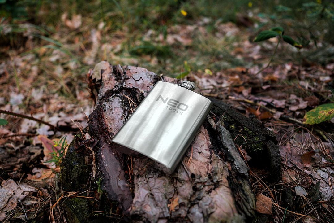 NEO TOOLS termoska iz nerjavečega jekla 220 ml 63–174 je termoska iz nerjavečega jekla s prostornino 220 ml, dimenzijami 140 × 94 × 26 mm. Ima neprepustni pokrovček s tečajnim pokrovom, ki preprečuje izgubo. Termoska NEO TOOLS je odporna proti poškodbam in ima certifikat LFGB za stik z živili. Je trpežno in praktično darilo za popotnike.