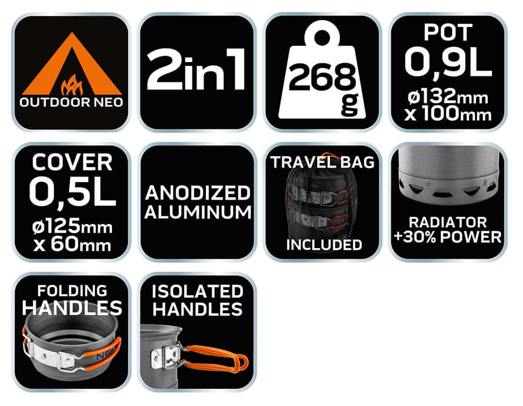 Komplet loncev 2 v 1 63–144 s hladilnikom znamke NEO vključuje lonec s hladilnikom, ki ščiti pred vetrom in poveča območje kuhanja za 30 %, ter praktično ponev. Lonec ima prostornino 0,9 l, višino 100 mm in premer 132 mm. Ponev ima prostornino 0,5 l, višino 125 mm in premer 60 mm. Komponente so izdelane iz zelo trpežnega, lahkega eloksiranega aluminija. Celoten komplet tehta le 268 g. Lonci so opremljeni z zložljivimi, izoliranimi ročaji in so varni za živila po standardu LFGB. Ta izdelek je idealen za izlete iz mesta in kampiranje. Priložena je praktična potovalna torba.