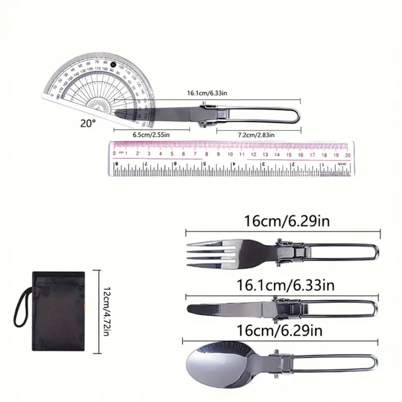 Set vključujeponev, lonec, pokrov, žlica, vilice, nožkot tudiprevleko in gobico za čiščenje. Vsak kos jezložljiva ali zložljivaza priročno shranjevanje in transport brez nereda.
