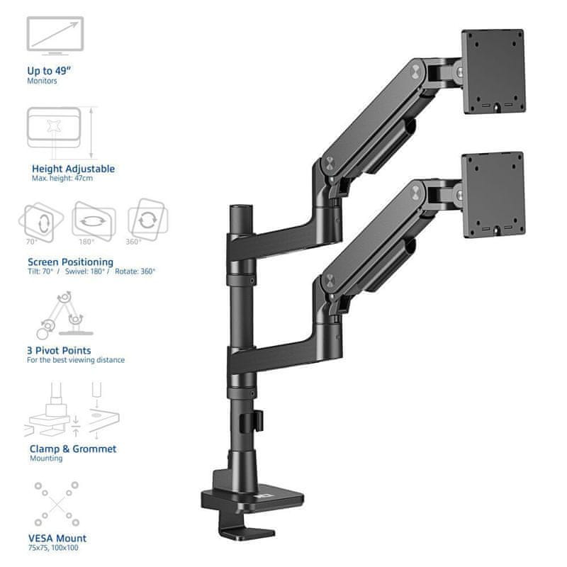 Dva monitorja do 49" in 20 kg | VESA 75×75 in 100×100 | Plinska vzmet | Možnost namestitve na drog | Nagib, vrtenje in zasukanje