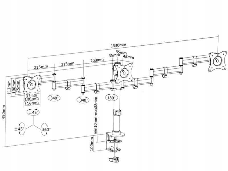 Univerzalni nosilec za LCD ali LED monitorje z možnostjo pritrditve na mizo ali ploščo mize. Nosilec je zasnovan za monitorje do 27" z največjo težo 8 kg na nosilec. Nosilec je izdelan iz najkakovostnejše kovine (kombinacija jekla, tlačno oblikovanega aluminija in plastike) v črni barvi, elementi nosilca monitorja so popolnoma usklajeni, kar zagotavlja stabilno in varno oporo za monitor.