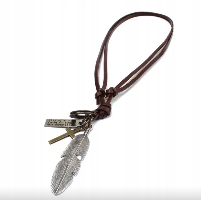 Ogrlica iz pravega usnja z okrasnim obeskom v obliki perja in križa je popolna kombinacija simbolike in stila. Rjav usnjen pašček in srebrni kovinski elementi ustvarjajo brezčasno celoto v boho in retro slogu.